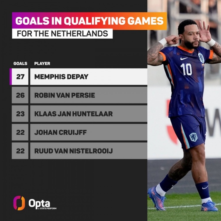 9月8日世预赛欧洲区赛事中,荷兰队凭借德佩的两粒进球,客场3-2力克立陶宛。根据Opta数据统计,德佩以27个进球成为荷兰队史预选赛(包括世界杯及欧洲杯预选赛)第一射手。