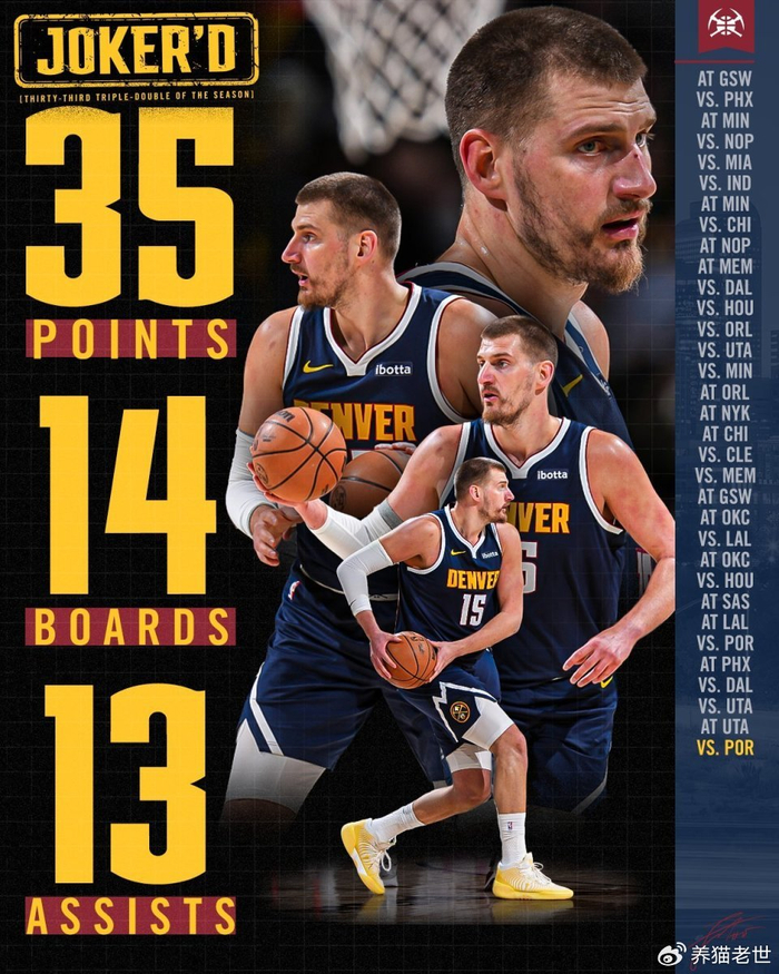 约基奇本赛季第33次拿到三双,断档领跑全联盟;生涯第197次轰下三双,排在历史三双榜第二位,距离超越威少仅仅只差13次三双,预计下赛季就能加冕历史三双王。